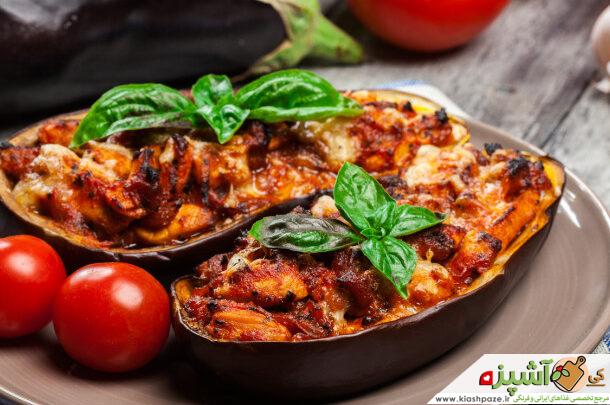 بادمجان را در سینی فر بگذارید و مخلوط گوجهفرنگی و گوشت چرخکرده را به نسبت مساوی در آنها بریزید. دوباره روی آنها را روغن زیتون بپاشید و به مدت ۳۰ دقیقه داخل فر بپزید. بعد از اینکه بادمجانها و مواد داخل آن به خوبی پختند، روی آنها را آبلیموی تازه بچکانید.
