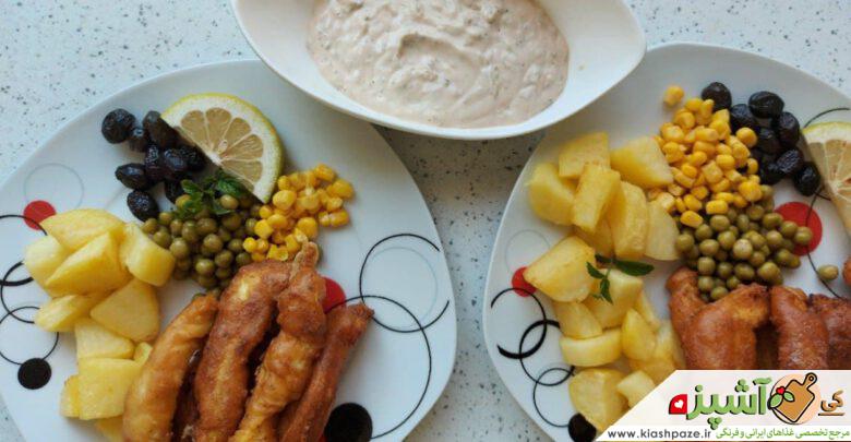 البته این غذا به همراه سس تارتار هم طرفداران زیادی دارد. مواد اولیهای که برای آماده کرده سس تارتار نیاز دارید: ۲ زرده تخم مرغ پخته و رنده شده، ۳ قاشق غذاخوری خیارشور خرد شده، ۱ قاشق غذاخوری پیاز خرد شده، ۳ قاشق غذاخوری سس مایونز، ۲ قاشق غذاخوری سس گوجه فرنگی و فلفل به میزان لازم. تمامی مواد ذکر شده را با هم مخلوط کنید تا یک سس تارتار خوشمزه داشته باشید.