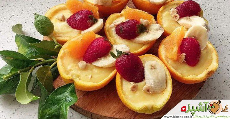از خوده پرتغال توشو خالی کرده برای قالب فرنی وآب پرتغال را از خوده پرتغال گرفته تا طبیعی باشد.