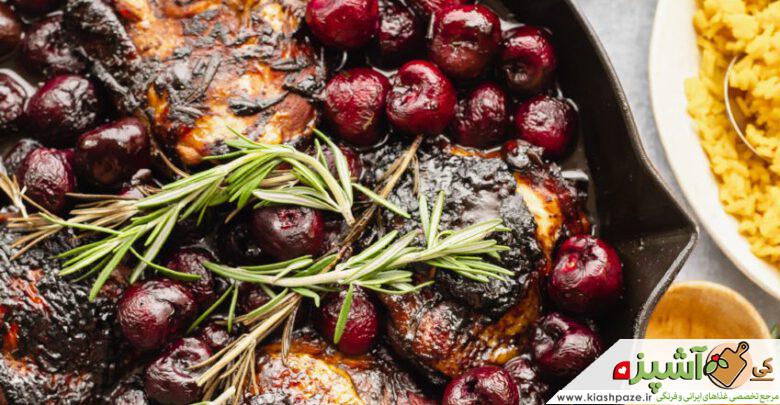 آلبالوهای تفت داده شده را به مرغ اضافه کنید و به آرامی هم بزنید.
