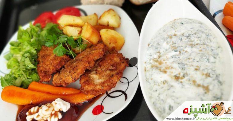 شنیسل مرغ خانگی یک وعده غذایی دلچسب و ترد خوشمزه + دور چین هویج وسیب زمینی آبپز