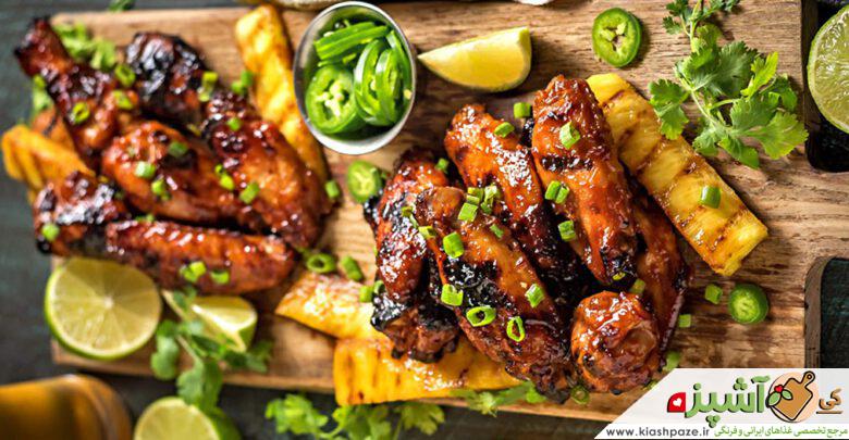 بال مرغ ترش و تند و گل کلم کبابی با زیره و ماست و پاچینی  در فر سیب زمینی سرخ شده در فر