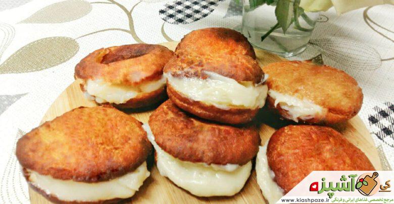 حالا در یک ظرف گود روغن بریزید و وقتی داغ شد، پیراشکی ها را سرخ کنید. بعد هم آن ها را کمی برش بدهید و از کرم وسط آن ها بگذارید.