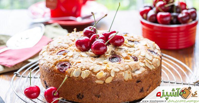 سپس باقی مانده مواد کیک را نیز بر روی آلبالوها بریزید.