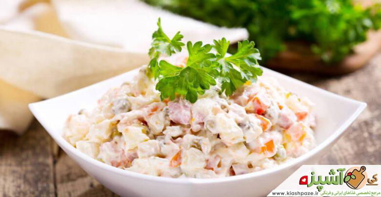 حالا مخلوط سس و ماست را هم می زنیم تا مواد ترکیب و یکدست شود. در ادامه سس را روی مخلوط سالاد می ریزیم و با قاشق زیر و رو می کنیم تا سس به خورد مواد برود. در ادامه روغن زیتون را روی سالاد می ریزیم.
